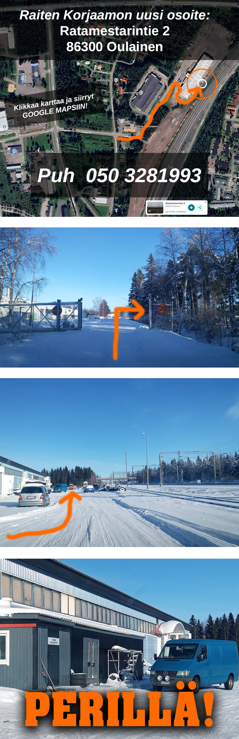Eli kuitenkin kysytte, miten pääsee pääovelle, tässä ohjeet. Aja osoitteeseen Ratamestarintie 2, 86300 Oulainen. Siinä heti tullessa oikialla on pitkä sininen halli. Aja sen taakse, radan viereen ja hallia pitkin niin kauan että tulet suoraan TÖIDEN VASTAANOTTO -pisteeseen.